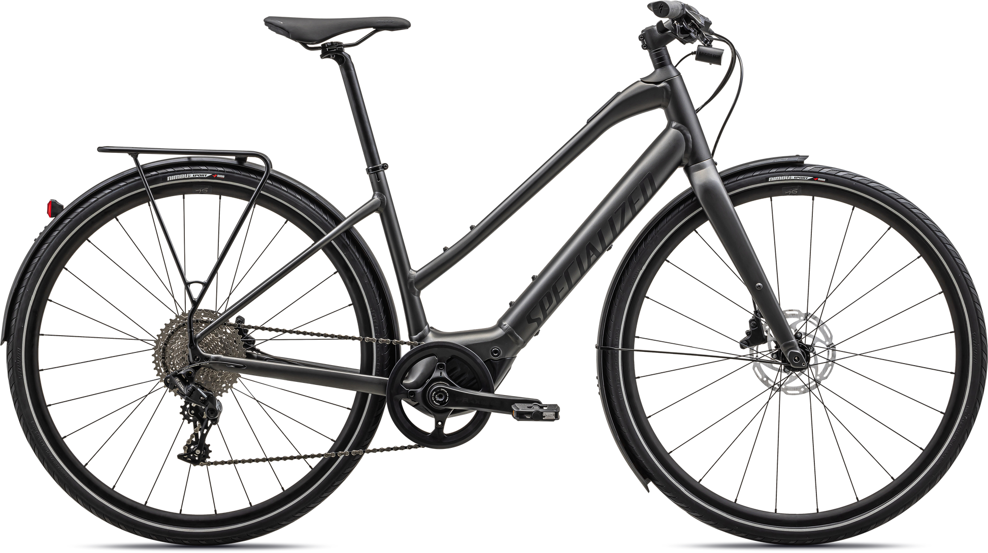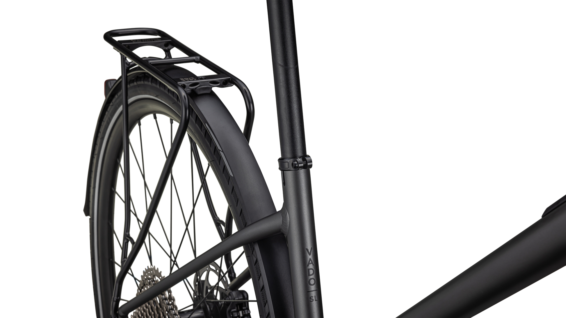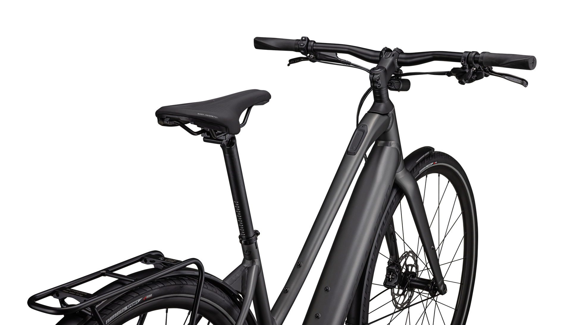 Turbo SL mounted rear rack, Racktime-compatible for your favorite bags and panniers, and DRYTECH fenders to keep the spray away.
